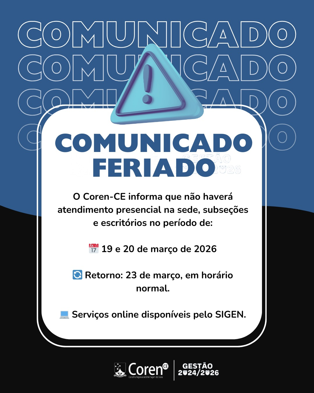 O Conselho Regional de Enfermagem do Ceará (Coren-CE) informa que não haverá expediente na Sede, subseções e escritórios administrativos no dia 19 e 20 de março de 2026, em razão do feriado de São José.