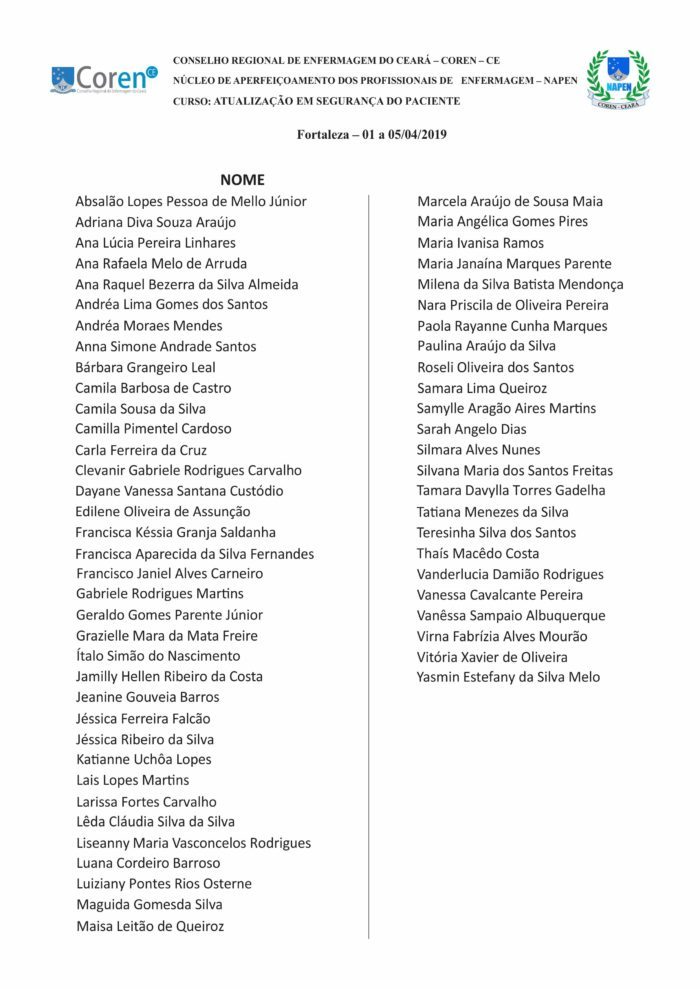 Confira a lista de inscritos para o curso de Segurança do Paciente em Fortaleza