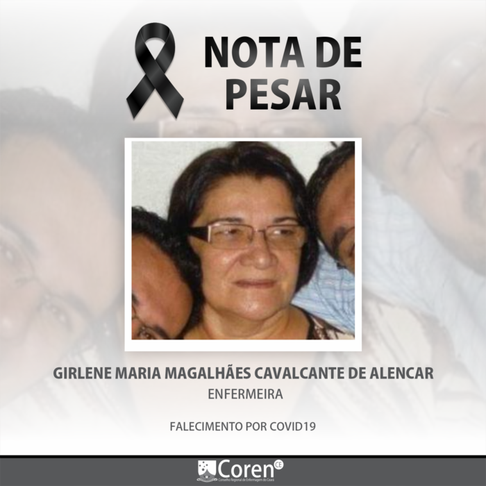 O Conselho Regional de Enfermagem do Ceará (Coren-CE) vem, através desta, comunicar o falecimento da enfermeira Girlene Maria Magalhães Cavalcante de Alencar, vítima da COVID-19.