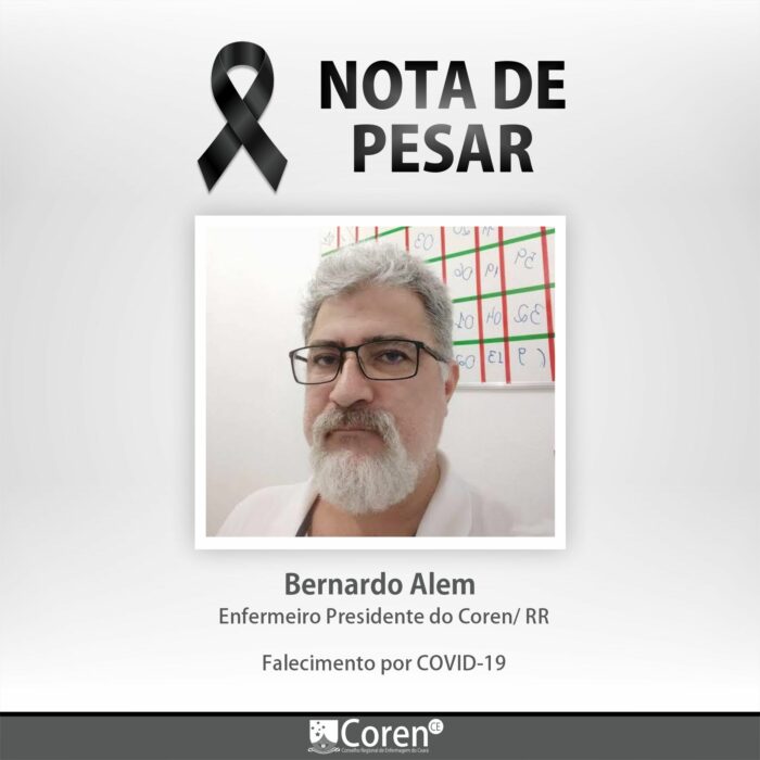 Em nome de toda a Enfermagem cearense, o Conselho Regional de Enfermagem do Ceará (Coren-CE) vem a público externar o seu pesar com o falecimento do enfermeiro Bernardo Alem, presidente do Coren Roraima, ocorrido hoje (27/02), vítima da COVID-19.