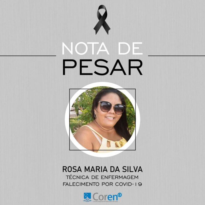 No momento mais crítico da pandemia em nosso Estado, o Conselho Regional de Enfermagem do Ceará (Coren-CE) vem, novamente, a público comunicar o falecimento de mais um trabalhador da Enfermagem. A técnica em Enfermagem Rosa Maria da Silva, de Jaguaruana, faleceu hoje (16/03), vítima de complicações decorrentes da COVID-19.