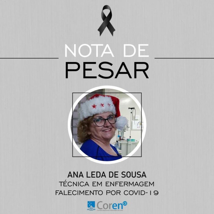 É com pesar que o Conselho Regional de Enfermagem do Ceará (Coren-CE) comunica o falecimento, por COVID-19, da técnica de Enfermagem Ana Leda de Sousa.