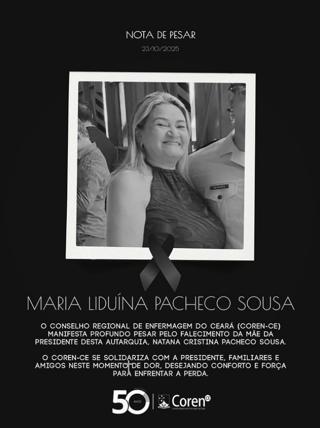 O Conselho Regional de Enfermagem do Ceará (Coren-CE) manifesta profundo pesar pelo falecimento de Maria Liduína Pacheco Sousa, mãe da presidente desta Autarquia, Natana Cristina Pacheco Sousa.