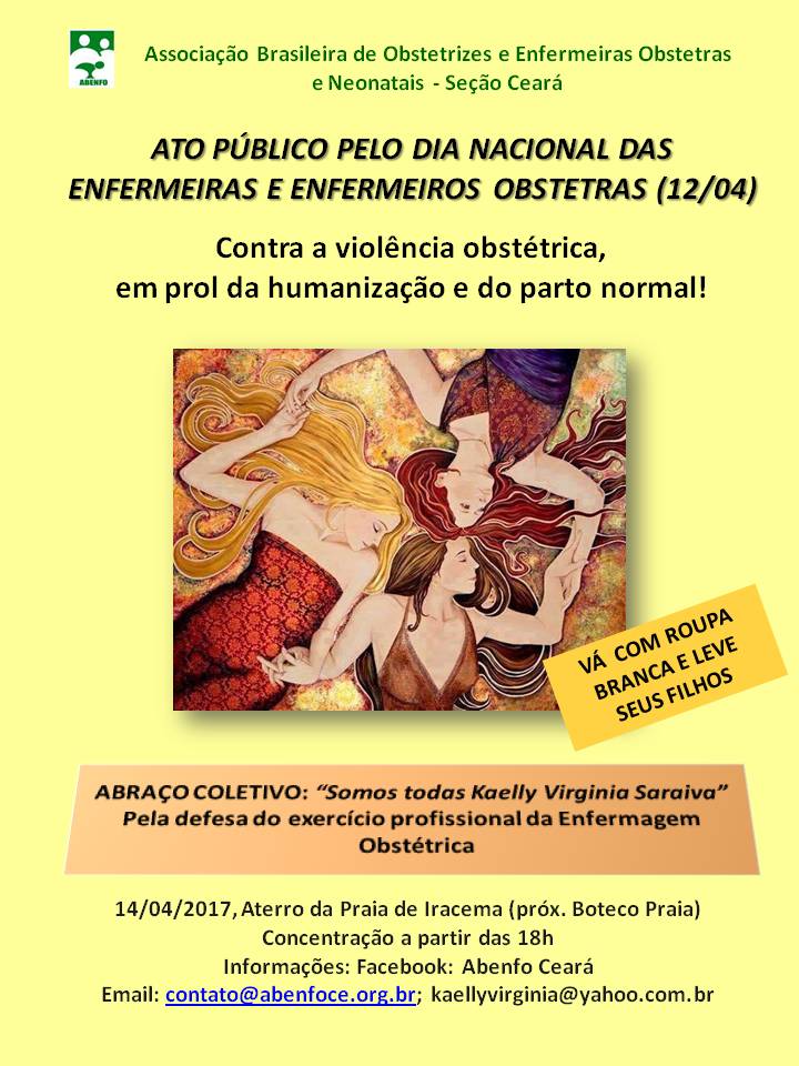 Dia 14 de abril (sexta-feira), às 18 h no aterro da Praia de Iracema, vamos juntar nossas vozes em ato público pelo Dia Nacional das Enfermeiras e Enfermeiros Obstetras. Participe!