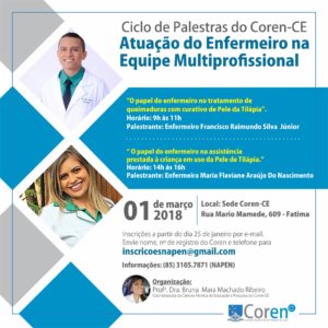 • 9h – “O papel do enfermeiro no tratamento de queimaduras com curativo de Pele de Tilápia”.