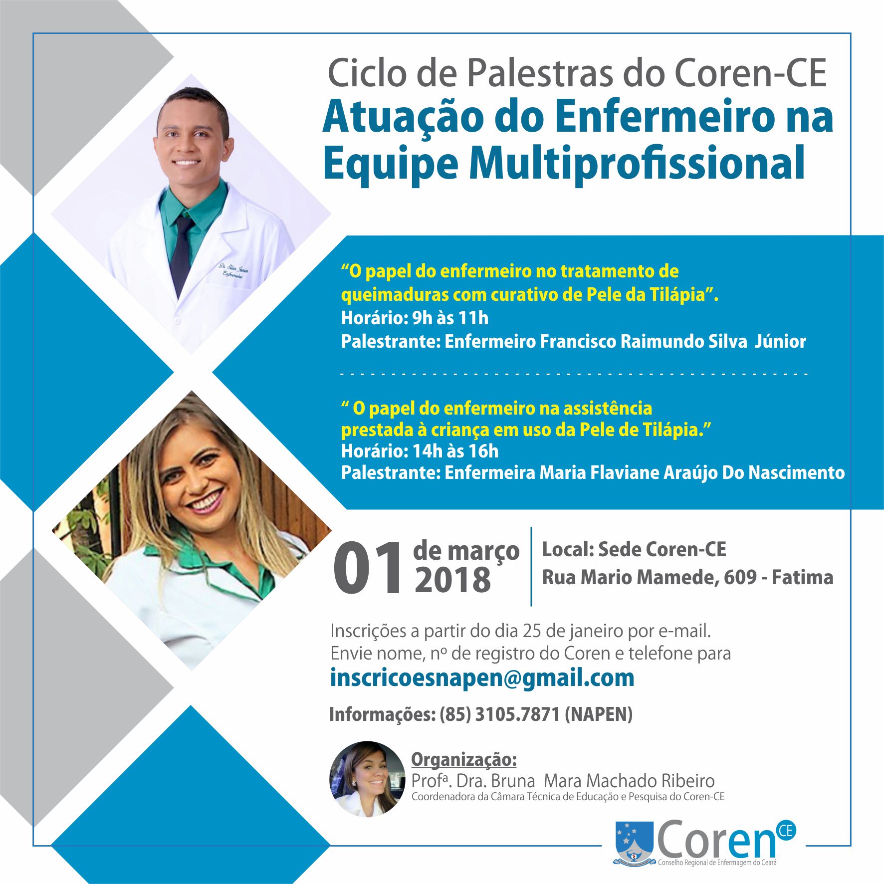 O Conselho Regional de Enfermagem do Ceará – Coren-CE – está com inscrições abertas para o primeiro Ciclo de Palestras de 2018. O evento, que acontece no próximo dia 01 de março, na sede do órgão cearense, terá como tema “A Atuação do Enfermeiro na Equipe Multiprofissional”.
