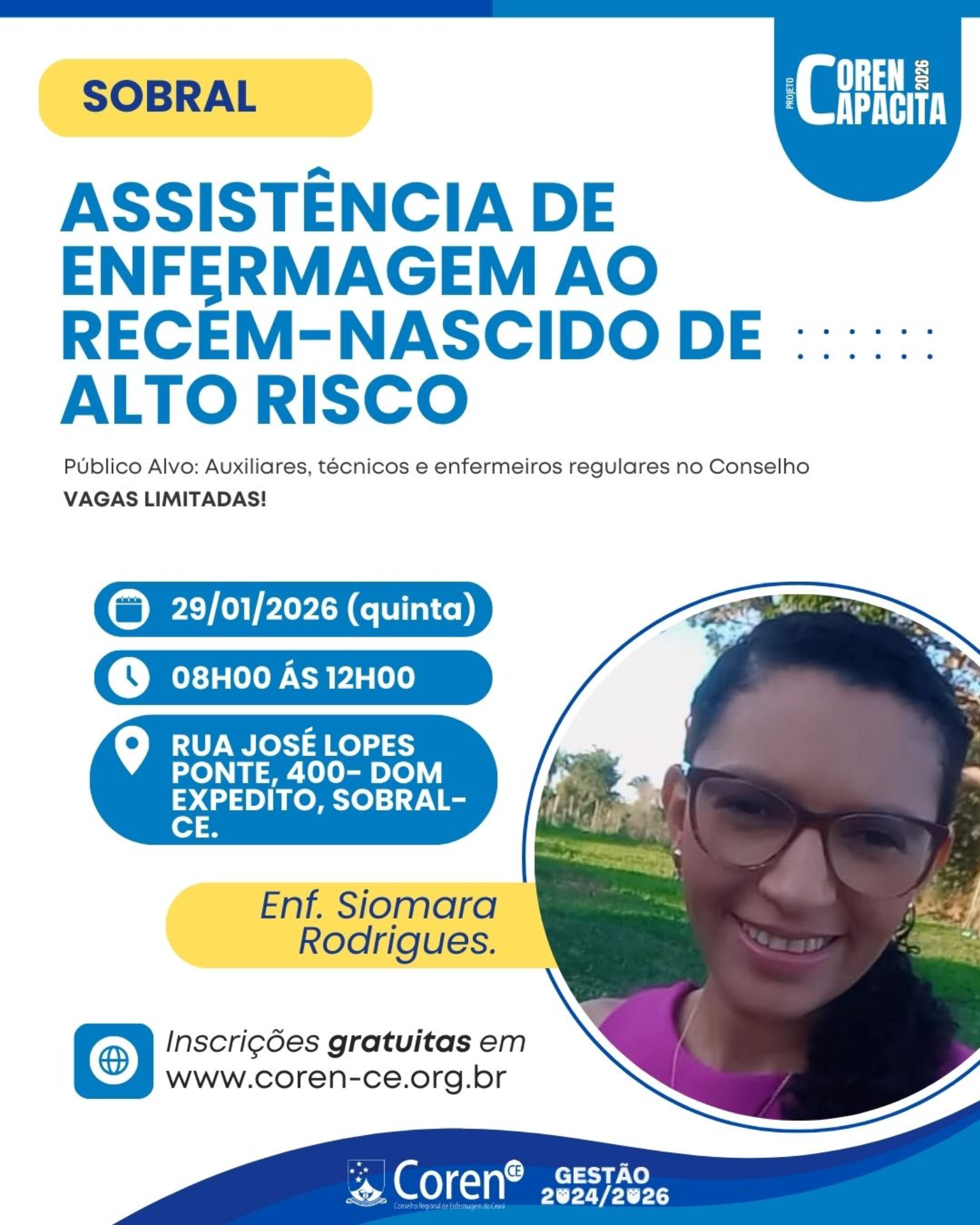 O Coren-CE, por meio do Projeto Coren Capacita 2026, realiza em Sobral a capacitação “Assistência de Enfermagem ao Recém-Nascido de Alto Risco”, com a Enf. Siomara Rodrigues.