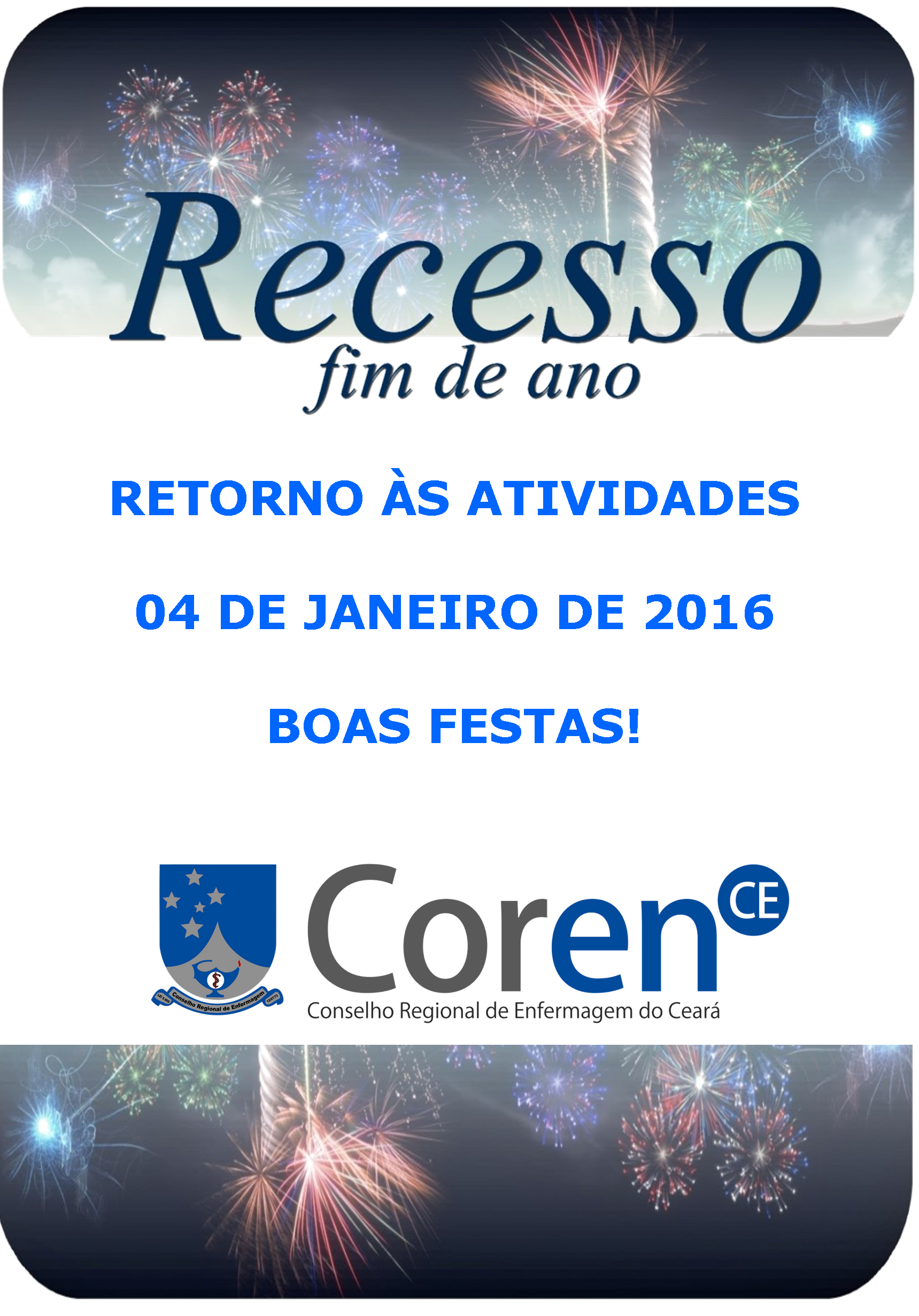 O Conselho Regional de Enfermagem do Ceará estará em recesso de 23 de dezembro de 2015 a 03 de janeiro de 2016, de acordo com a Portaria Coren nº 451/2015.