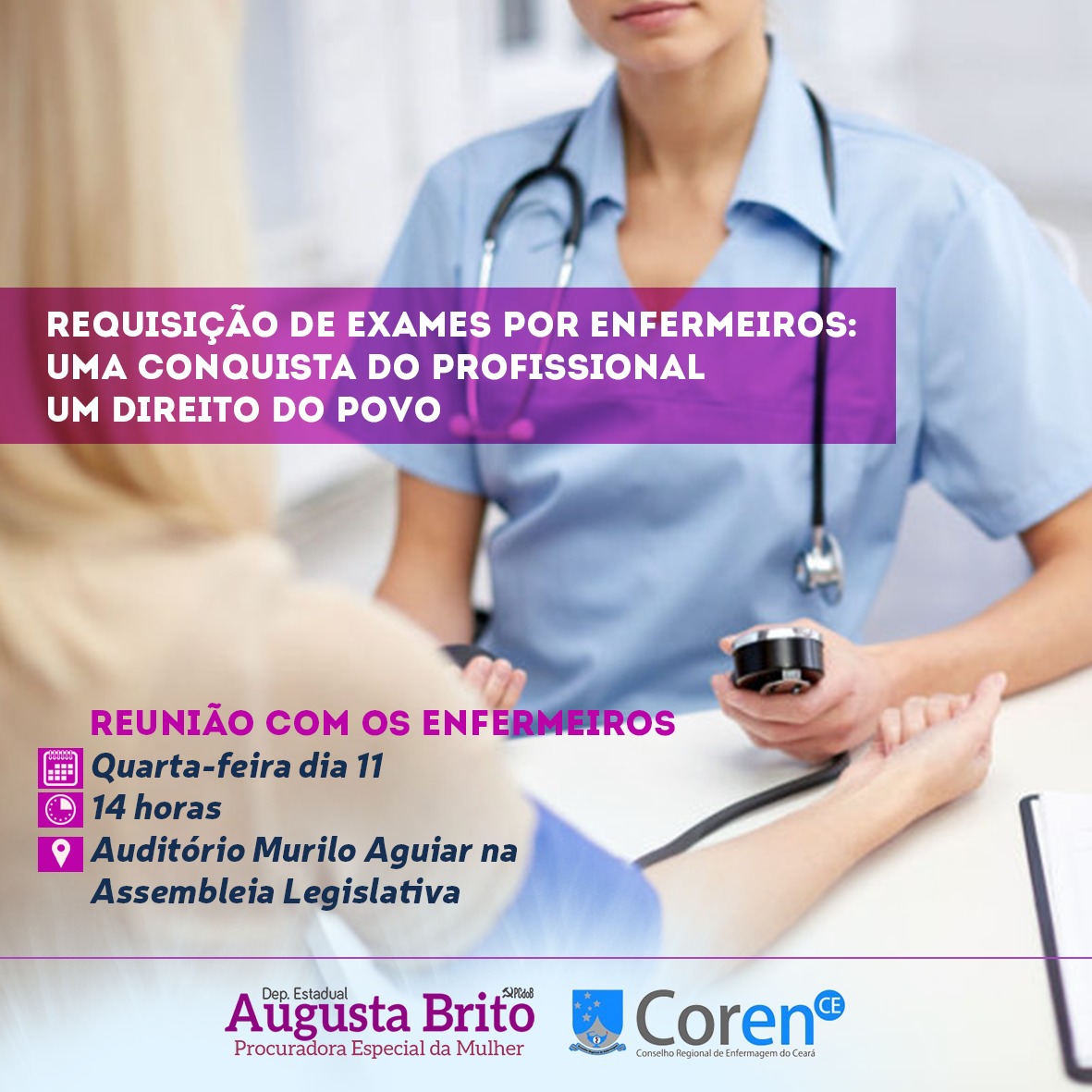 A deputada estadual enfermeira Augusta Brito atendendo a solicitação do presidente do Conselho Regional de Enfermagem do Ceará, Osvaldo Albuquerque sousa Filho convida a comunidade de Enfermagem para debater a nova Política Nacional de Atenção Básica – PNAB e da Decisão Liminar no processo movido pelo Conselho Federal de Medicina contra a União Federal.