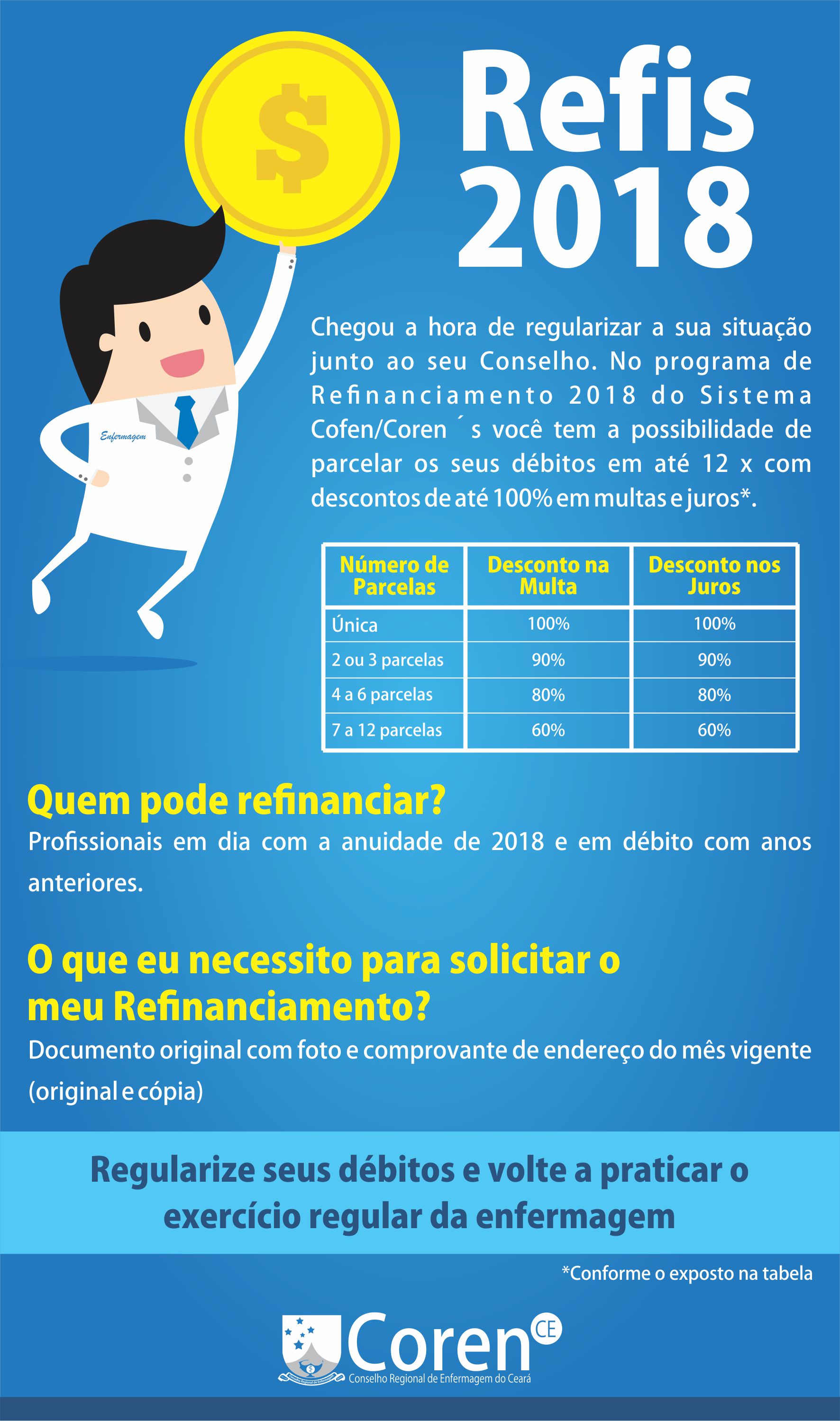 O Conselho Regional de Enfermagem do Ceará (Coren-CE) inicia na próxima segunda-feira (13/08) o Programa de Refinanciamento (Refis) 2018. Profissionais em débito com o Conselho poderão parcelar as pendências em 12 vezes com até 100% de desconto em multas e juros.