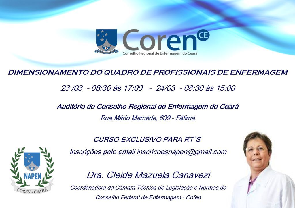 O Conselho Regional de Enfermagem do Ceará, através do Núcleo de Aperfeiçoamento dos Profissionais de Enfermagem (NAPEN), convida Enfermeiros Responsáveis Técnicos para participar do CURSO DE DIMENSIONAMENTO DO QUADRO DE PROFISSIONAIS DE ENFERMAGEM, que se realizará nos dias 23 e 24 de MARÇO no Auditório do Conselho Regional de Enfermagem do Ceará – Rua Mário Mamede, 609 – Fátima – Fortaleza/CE