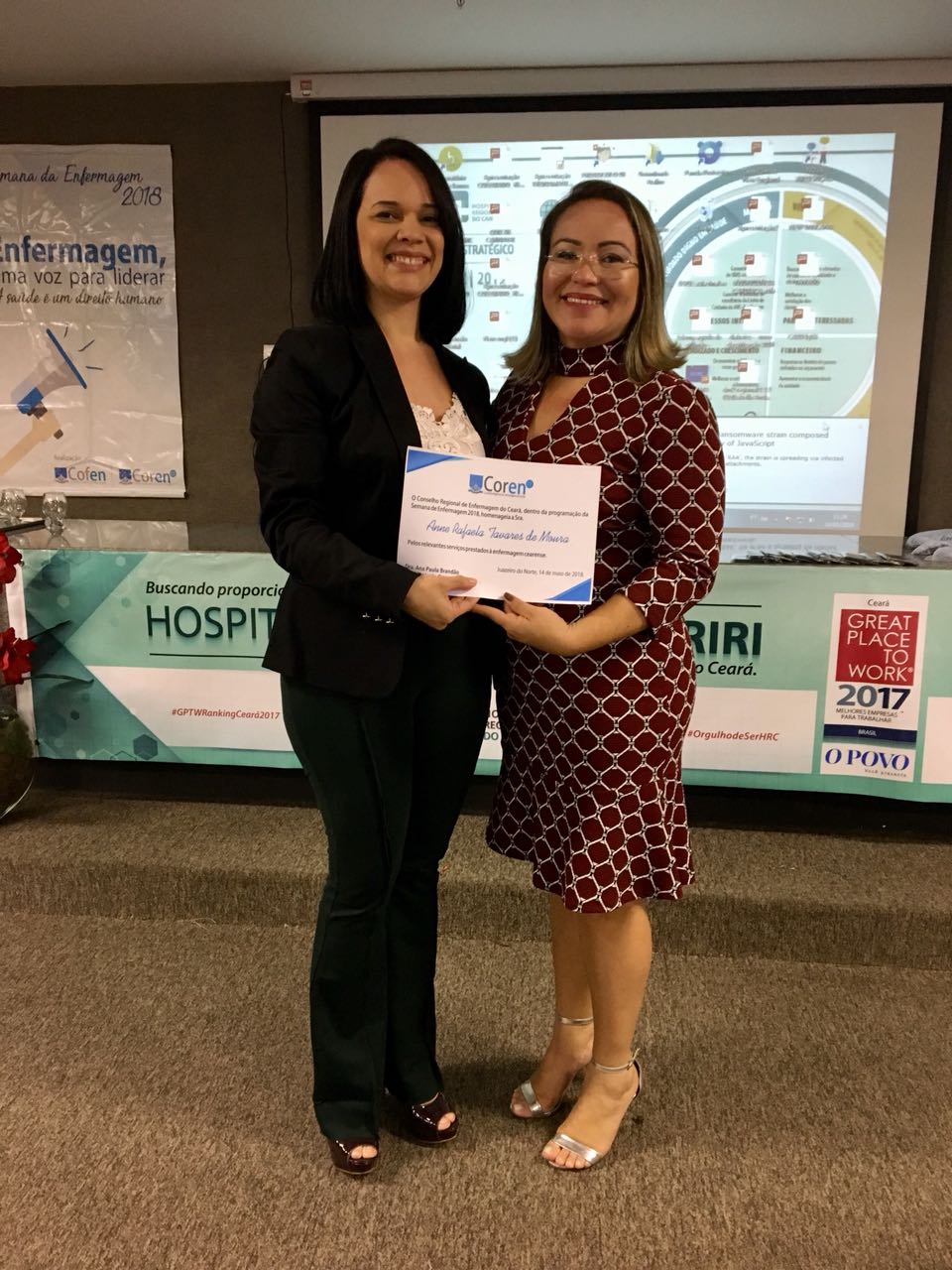 Como parte do programação o Coren-CE prestou homenagem às enfermeiras Ana Paula Ribeiro e Anne Rafaela Tavares. As duas receberam da presidente a condecoração que reconhece o brilhantismo do trabalho desenvolvido pela enfermagem do Cariri.