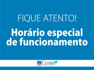 O Conselho Regional de Enfermagem do Ceará (Coren-CE) informa que na próxima sexta-feira (02), excepcionalmente, seu horário de funcionamento será de 8h as 15h, na sede do órgão em Fortaleza. Já nas subsedes o funcionamento será de 8h as 12h.