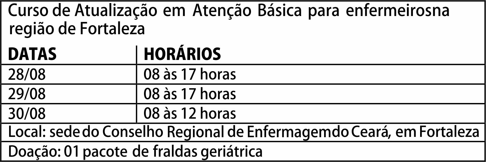 Em mais uma iniciativa de promoção de capacitação permanente o Conselho Regional de Enfermagem do Ceará (Coren-CE) inicia hoje (22/08) as inscrições para o curso de Atualização em Enfermagem na Atenção Básica. A nova turma é voltada para enfermeiros e acontecerá nos dias 28, 29 e 30 de agosto, na sede do Coren-CE, em Fortaleza.